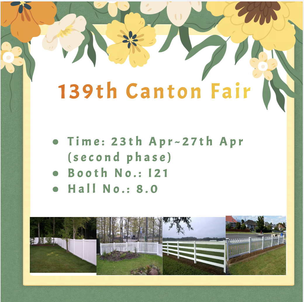 The 139th Canton Fair will be held in April, divided into three phases, covering an exhibition area of 1.55 million square meters and 75,500 booths, with exhibits covering multiple industries. Our PVC fences will be exhibited under the "Gardening Supplies" category, located in Hall A8.0. Deqing Huazhijie Railing & Fencing Co.,Ltd. has participated in the fair for many years. We welcome you to visit us to learn more about our PVC fence products and discuss cooperation opportunities. We look forward to your visit!